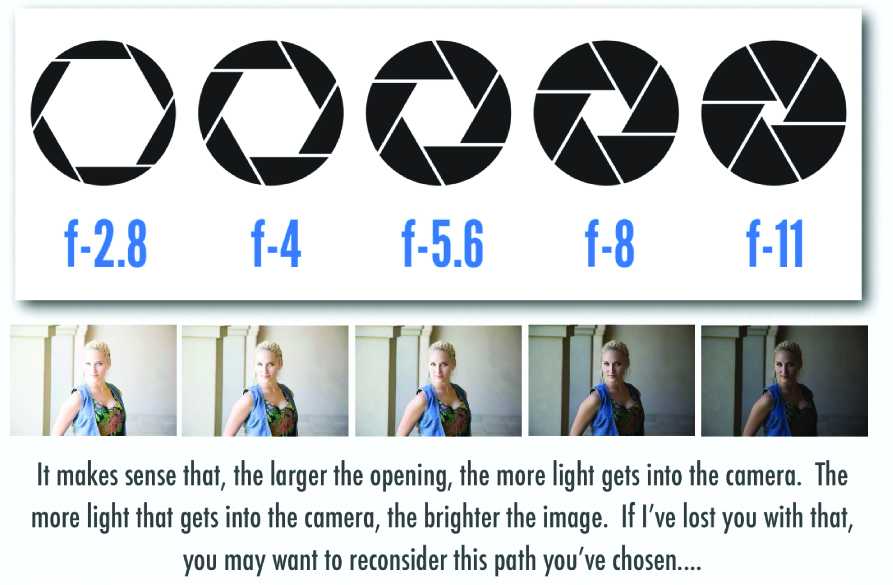 The f-stop controls the size of the lens opening (hole) when you take a picture. Change the f-stop, and you’ll change how much the lens opens. As you might expect, this opening affects how much light flows into the camera through the lens. The last part is going to blow your mind: the more light that enters the camera makes the image BRIGHTER! I’m serious.