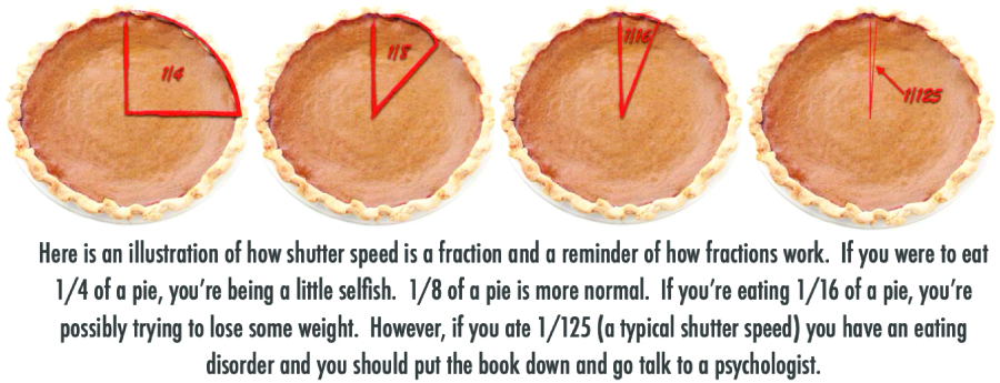 The shutter speed is represented usually by a fraction. This is a fraction of a second. For those of you who haven’t thought about fractions in a while, think of a fraction as how much of a pie you would eat.